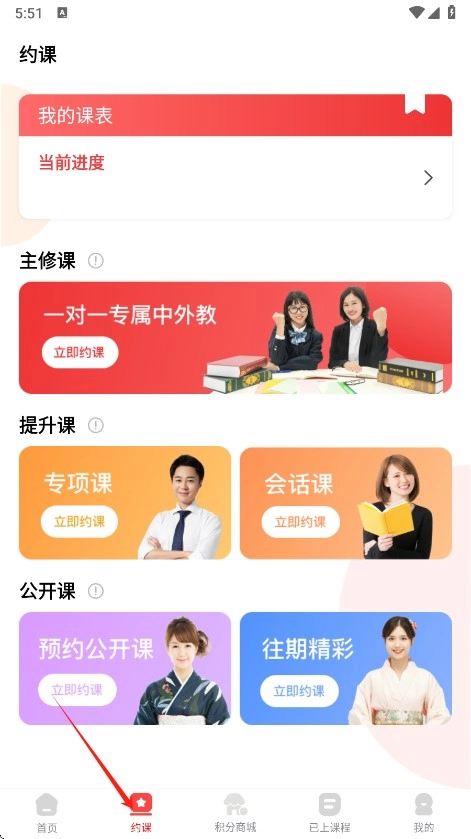3、进入【约课】板块,自主挑选感兴趣的课程与教师。