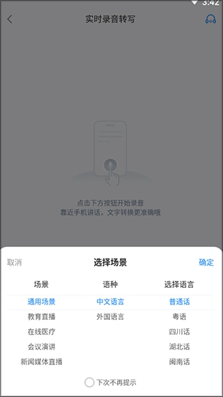 3、点击录音界面右下角的【普通话】选项,可按需切换不同场景语种或其他语言,以保证识别的准确性。