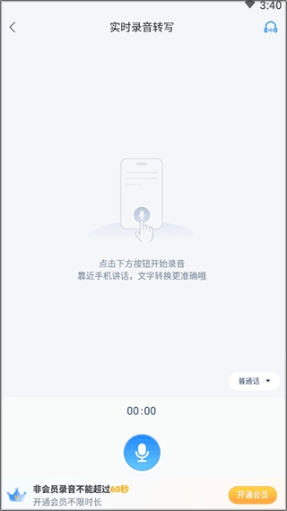 2. 当进入录音界面,点击位于下方的圆形录音按钮,即可开始录音,采集需要转写的语音内容。
