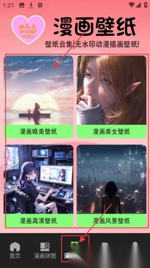 2. 接下来切换至漫画壁纸页面,此页面设有漫画唯美、美女等多种壁纸分类。你可以挑选感兴趣的分类,尽情浏览心仪的漫画壁纸。
