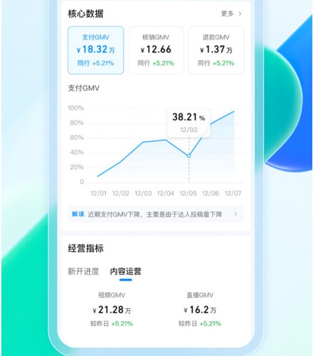 直播、短视频观看、带货数据、订单交易流水、用户数据分析等等,一目了然引导经营~