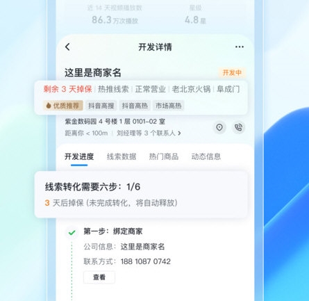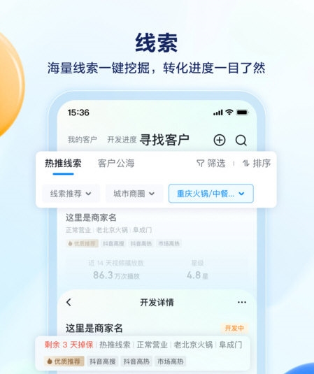抖音销帮是成都所见所得科技有限公司开发的一款非常好用的销售效率平台,为广大用户提供最便捷的办公辅助,轻松管理日常订单业务,从而更好的进行销售。软件为销售提供客户线索、经营数据、业绩追踪、过程拜访等销售作业全流程能力。赋能BD科学管理客户资源,帮助管理者高效管理团队。通过抖音销帮,还能去进行数据分析,了解客户的线索。软件聚合海量线索,帮助用户深度挖掘追踪,客户的多方面信息多维度呈现出来,个人经营情况一览无余,帮助用户提供转化效率。软件极大地提高了服务商对销售人员过程质量的把控能力,以及销售变现效率,同时也帮助优化了销售人员的办事效率,进一步渗透到生活服务市场。如果你也想尝试这款软件的话,那就赶快试试吧!