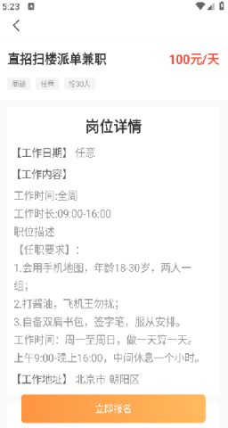 3、兼职岗位详情页清晰展示工作内容、薪资待遇、工作地点及报名截止时间等关键信息,便于快速筛选。