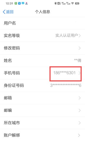 2、在这里你会看到用户信息的相关内容,包括姓名、身份证号、手机号等等,我们直接点击手机号即可修改。