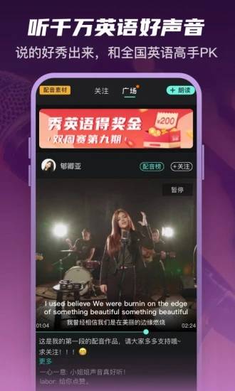 模仿秀功能聚集了千万用户上传的配音作品,关注互动功能打造类社交学习氛围。