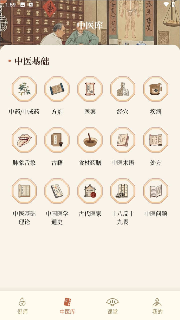 2、随后点击下方的“中医库”,便能看到丰富的中医古籍内容。(猜测“估计”为“古籍”笔误,按此修正,若并非笔误请说明)