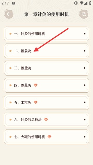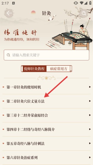 2、接下来在针灸页面,随意挑选一个章节内容,具体可参照图示。