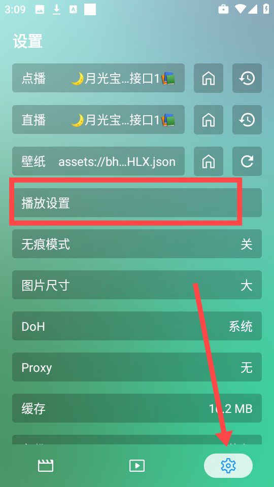 1. 打开软件后,轻点右下角的设置按键,查找“播放设置”。