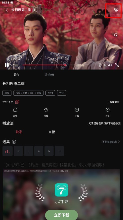 4、点击您想看的影片,软件会自动加载并播放。在播放界面,点击右上角的TV图标。