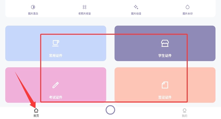 启动应用后即可进入主界面,多种证件照制作相关功能有序展示,能让用户迅速找到并选择自己需要的服务。