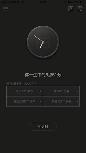 软件界面设计得十分简约,给人一种清新舒适的感觉。打开软件后,首先需要设置你的出生日期,确认无误后就能进入“生之时”界面。在这个页面中,会清晰地展示出你来到这个世界后所经历的年份、月份、周数、天数、小时数以及分钟数等详细信息。