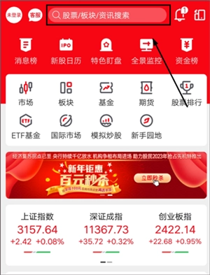打开指南针股票进行登录,接着点击首页上方的【搜索栏】开展查找操作。