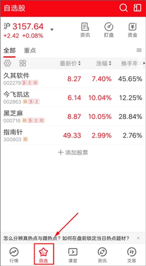 用户添加完成的多支自选股票,可通过点击首页底部的【自选】选项进行查看。