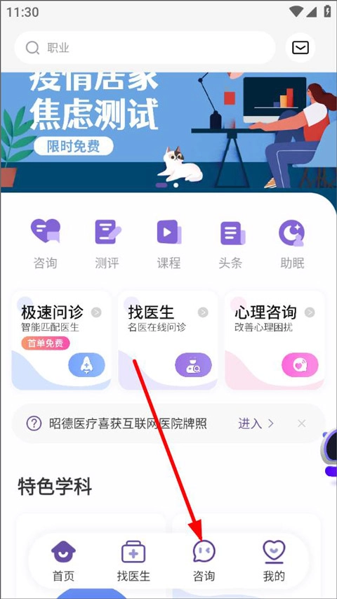 打开昭德心理应用,完成注册登录后进入首页。首页设有咨询、测评、课程等功能模块,用户可在此进行极速问诊、查找医生或开展心理咨询服务。此外,首页还支持查看特色学科,用户可直接点击进入咨询板块。
