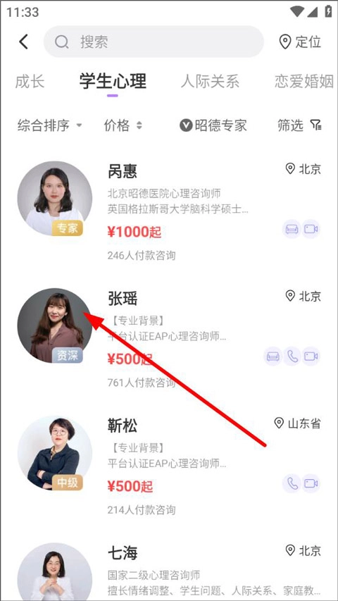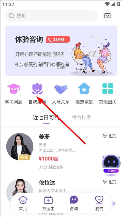 进入咨询页面后,用户能够依据咨询类型进行选择,这些类型涵盖了学习问题、自我发展、人际关系等方面。