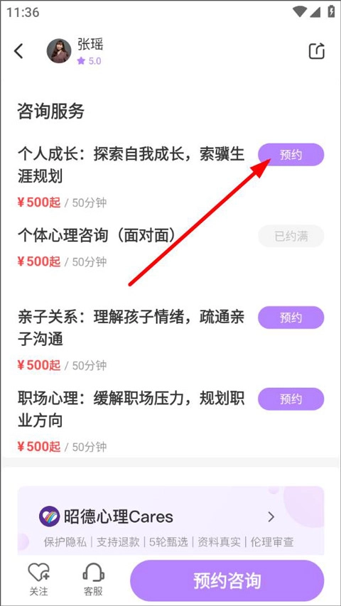 咨询服务页面上,医生的擅长领域会清晰列出,像个人成长、亲子关系、职场等方向都包含在内,用户可以通过点击页面左侧的预约按钮来进行预约操作。