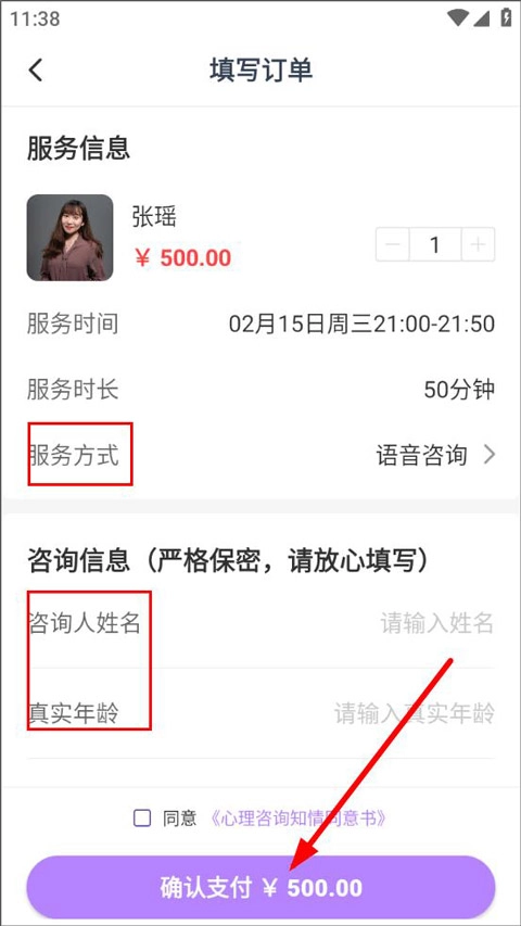进入订单填写页面后,用户能够切换选择服务方式,填写咨询人的姓名与年龄,确认支付后即可完成预约。