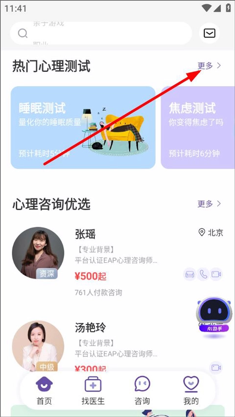 打开昭德心理应用,登录后进入首页。在首页,你可以进行极速问诊、查找医生以及查看特色学科。接着下拉页面找到热门心理测试板块,然后点击该板块的“更多”按钮。