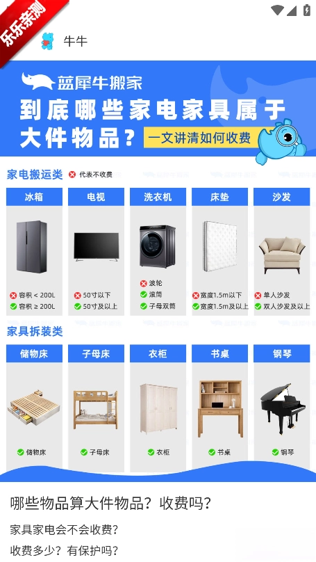 蓝犀牛搬家推行明码标价的收费模式,用户下单前就能清晰知晓车型费、里程费、楼层费等各项费用明细。这种透明的收费方式有效杜绝了隐形消费与坐地起价的问题,极大提升了用户的消费安全感。