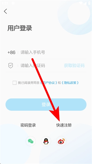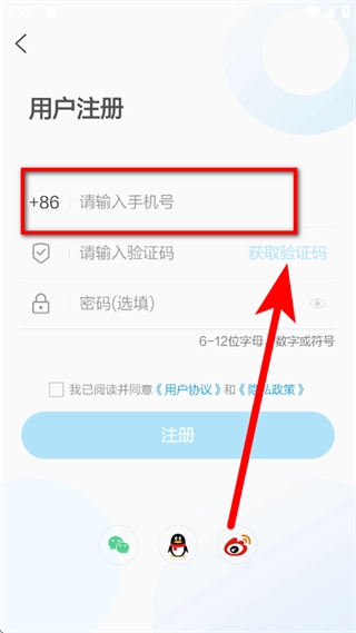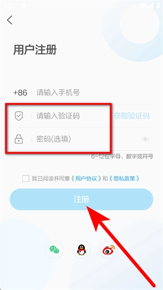 完成账号注册需依次进行以下操作:输入验证码、设置密码,勾选相关协议后点击注册按钮。