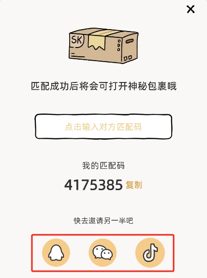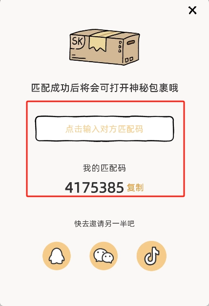 在弹出的匹配窗口中输入我们的另一半提供的匹配码。