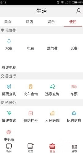 这个页面划分出了各类便捷的生活服务板块,涵盖便民服务板块、娱乐服务板块以及酒店服务板块等。