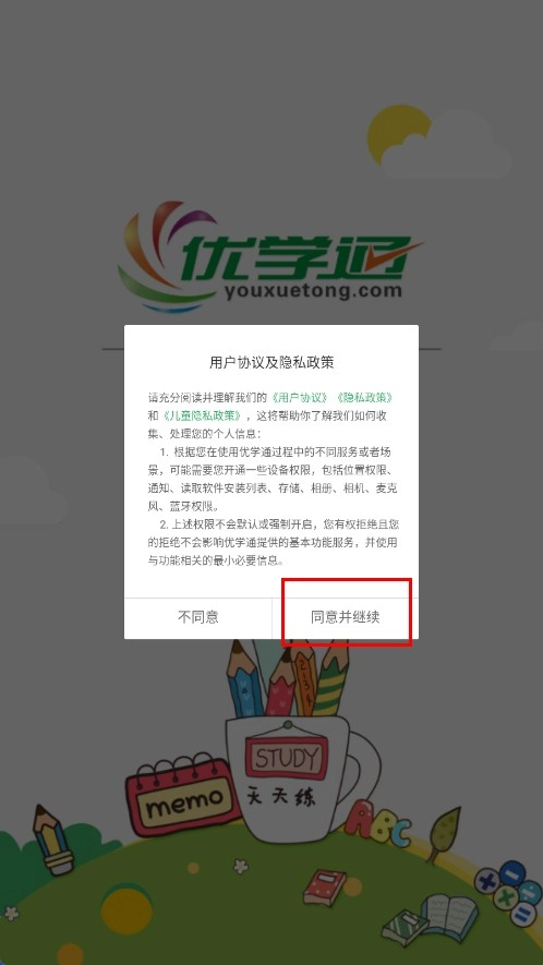 在用户协议与隐私政策的弹窗界面中,点击【同意并继续】功能按钮。