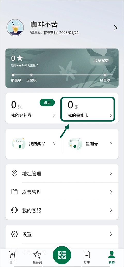 首先进到星巴克,在“我的”界面选择“我的星礼卡”