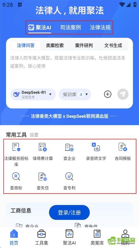 登录账号后,页面上方设有聚法AI、司法案例和法律法规三个功能模块,您也可以通过下方的常用工具查询各类法律问题。