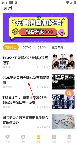 4、登录操作完成后,切换至资讯页面,选择“英雄联盟”分类,查看与之对应的赛事资讯以及观赛指南。
