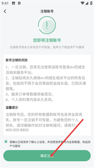 4、进入【注销账户】页面后,请仔细阅读并确认账号注销相关的风险及提示内容,随后勾选确认选项,点击【确定注销】按钮,即可完成账户注销流程。
