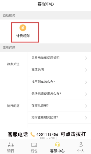 3、点击底部的【客服中心】选项,进入客服中心页面后,找到并点击【计费规则】,就能查看电单车的收费标准了。