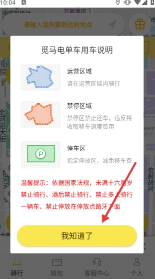 1、打开觅马出行应用,先熟悉用车相关规则,之后点击【我知道了】按钮。