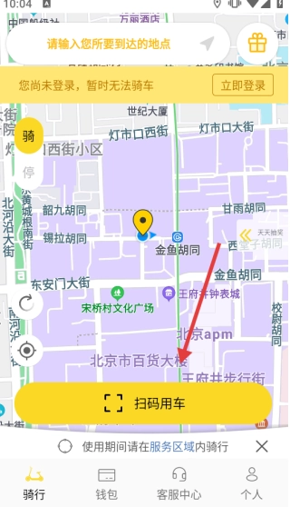 2、点击【扫码用车】按钮,即可扫描电单车上的二维码解锁车辆进行骑行。