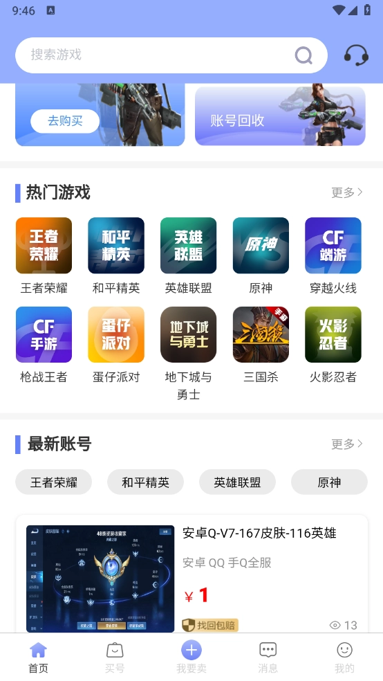 2、在首页以及买号板块提供了热门游戏账号的购买服务。