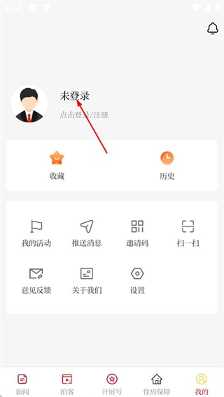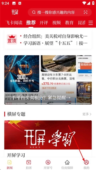 1、打开开屏新闻后,在首页找到底部导航栏中的“我的”选项并点击,即可进入个人中心页面。