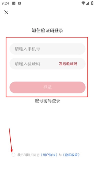 3、在登录页面,先勾选相关协议,接着填写所需信息,最后点击登录按钮即可完成操作。