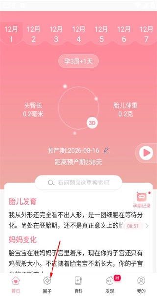 打开软件后,会呈现孕期进度及胎儿发育相关信息,其中包含孕周等内容,用户可选择对应的圈子进入相应功能页面。