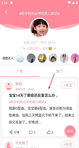 进入圈子页面后,会呈现热门分类与精彩话题,从中选择新手妈妈必学的育儿知识话题,即可进入详情页。