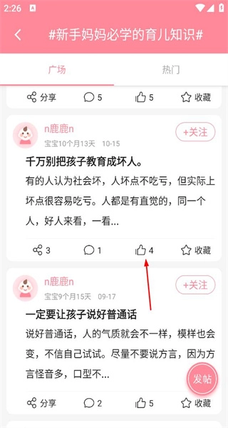 4、继续浏览话题里的育儿帖子,找到点赞按钮并点击,以此完成对这条育儿分享内容的互动。