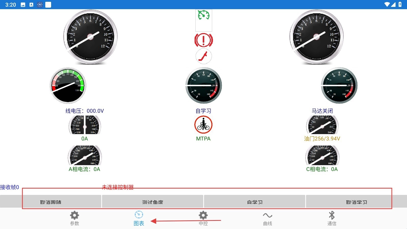3、切换至【图表】标签页,点击【取消限暗】【测试角度】等按钮,开展电机调试操作。