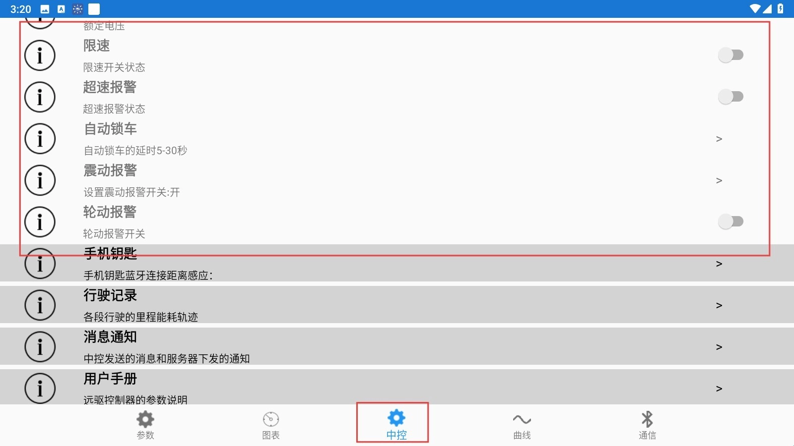 4、进入【中控】页面,点击限速、超速报警等功能的开关,对车辆安全参数进行配置。