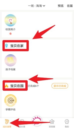 2、在首页点击成长故事栏目,可以进入宝贝在家和宝贝在园两大模块,分别记录家庭和幼儿园的成长瞬间。