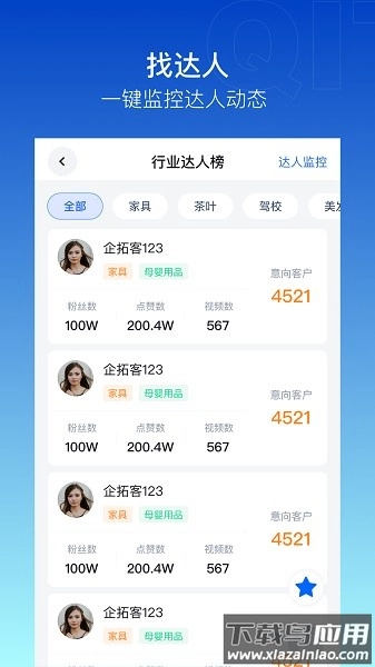 企拓客是一款专注于企业客户拓展的专业移动应用工具,能助力企业高效管理客户资源、简化拓客流程、提升整体运营效率。该软件操作简便、功能实用,其的多种线索数据与营销模块,可为企业市场开发工作提供强有力的支持。
