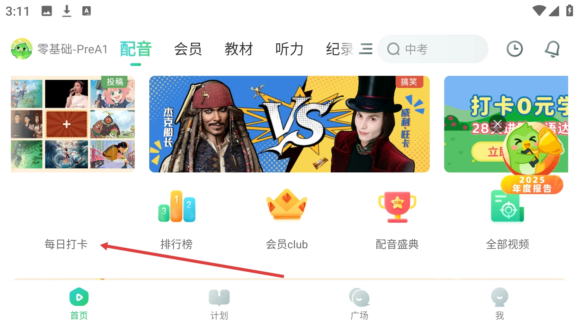 1、打开英语趣配音的首页后,找到并点击“每日打卡”这个选项,即可进入到打卡任务的页面。