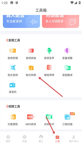 1、进入工具页面,在音频工具分类下找到【格式转换】选项。