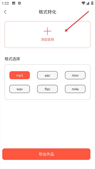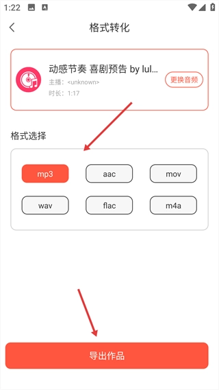 4、回到格式转换页面,选定目标输出格式,点击“导出作品”按钮,完成音频格式的转换。