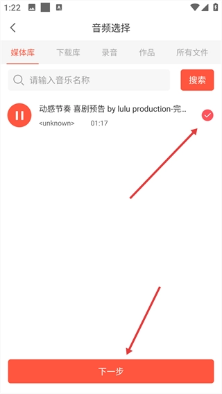 3、在音频选择界面中,选定目标音频,点击“下一步”按钮。