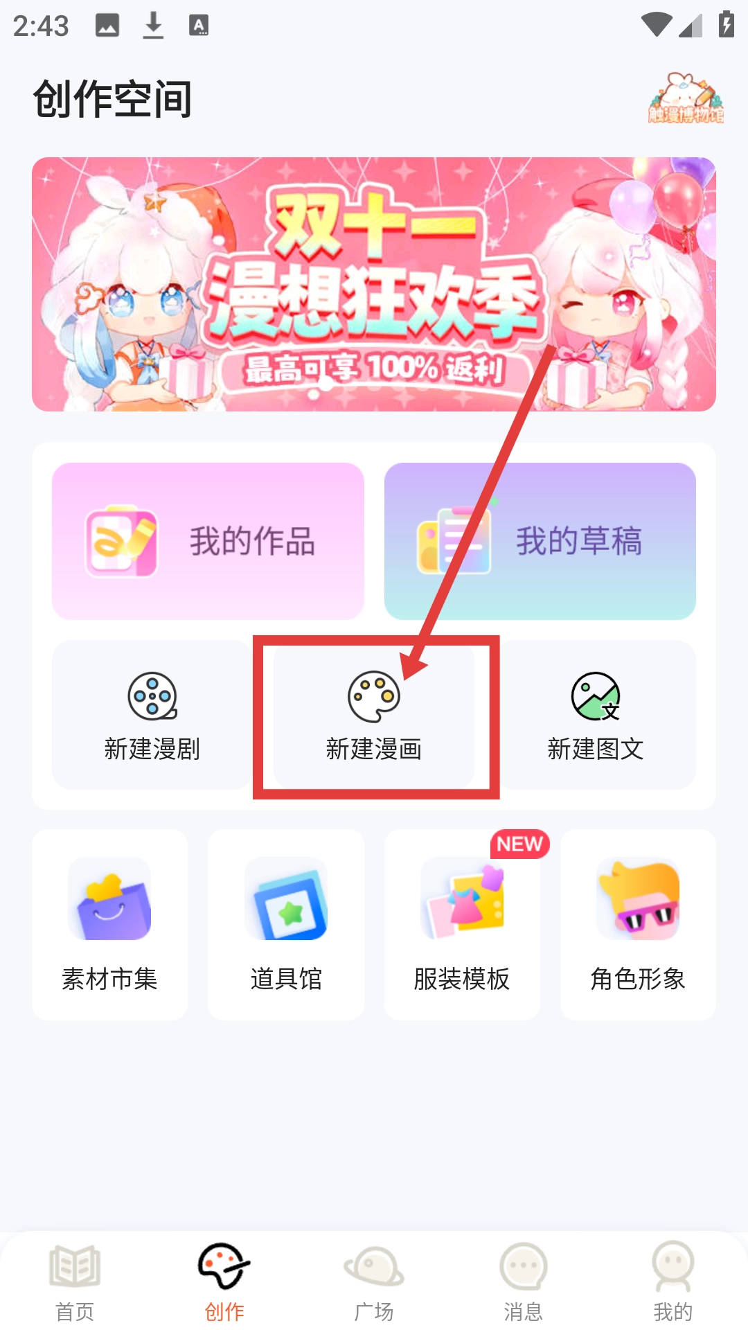 在创作空间界面点击【新建漫画】按钮,就能进入漫画创作的准备界面了。