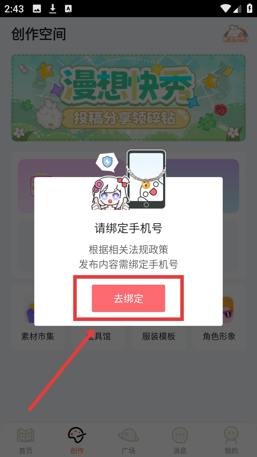 要是需要绑定手机号,点击【去绑定】完成手机号绑定,就能继续创作啦。